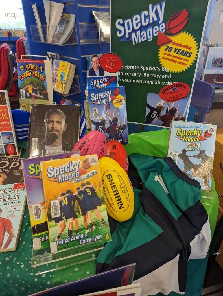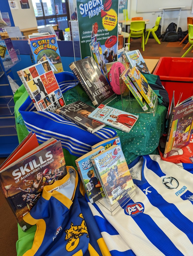Following up on my review of Specky’s 20th anniversary edition – as the actual birthday is today – it was timely to kick off the 2022 footy season with not only a display to feature everyone’s favourite young AFL player, but the code itself. And of course, an opportunity to have a ‘win’ incentive to encourage the borrowers in my new library!. Thanks Felice Arena & Garry Lyon, for bringing us all such a great character, who just never gets old! and also thanks, to one of my new specky-tacular library assistants, Gretchen, who kindly brought in her son’s AFL jersey collection to add to our display!