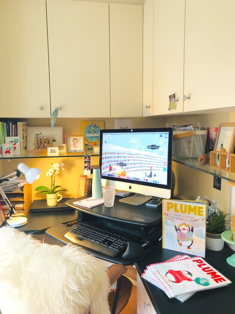 It’s a light, bright studio at the front of our house—with a lovely nook for my Mac, lots of cupboards and space for books … and, of course, there are lots of books! There’s also artworks and toys and photos and knickknacks from our travels that inspire and uplift me.