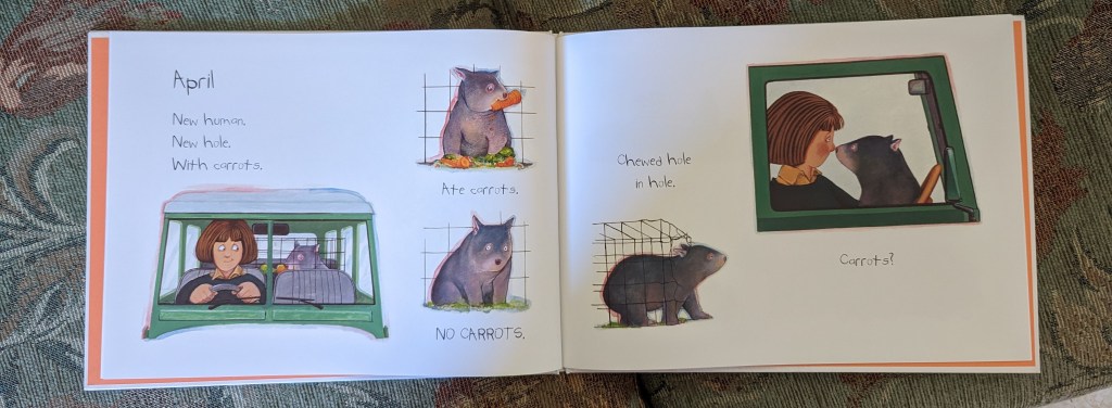 Following the immediately recognisable format of the first – and ensuing books – readers can trace Mothball’s journey from tiny furless solitary joey to rambunctious and bossy big girl, now grandmother. All of us who follow Jackie’s socials love to see the parade of wombats (and other creatures) who make themselves at home at her place. And some of us, such as myself, who have been fortunate to visit Jackie’s place (a couple of times) have been equally excited by significant wombat aspects as with chatting with Jackie :-).