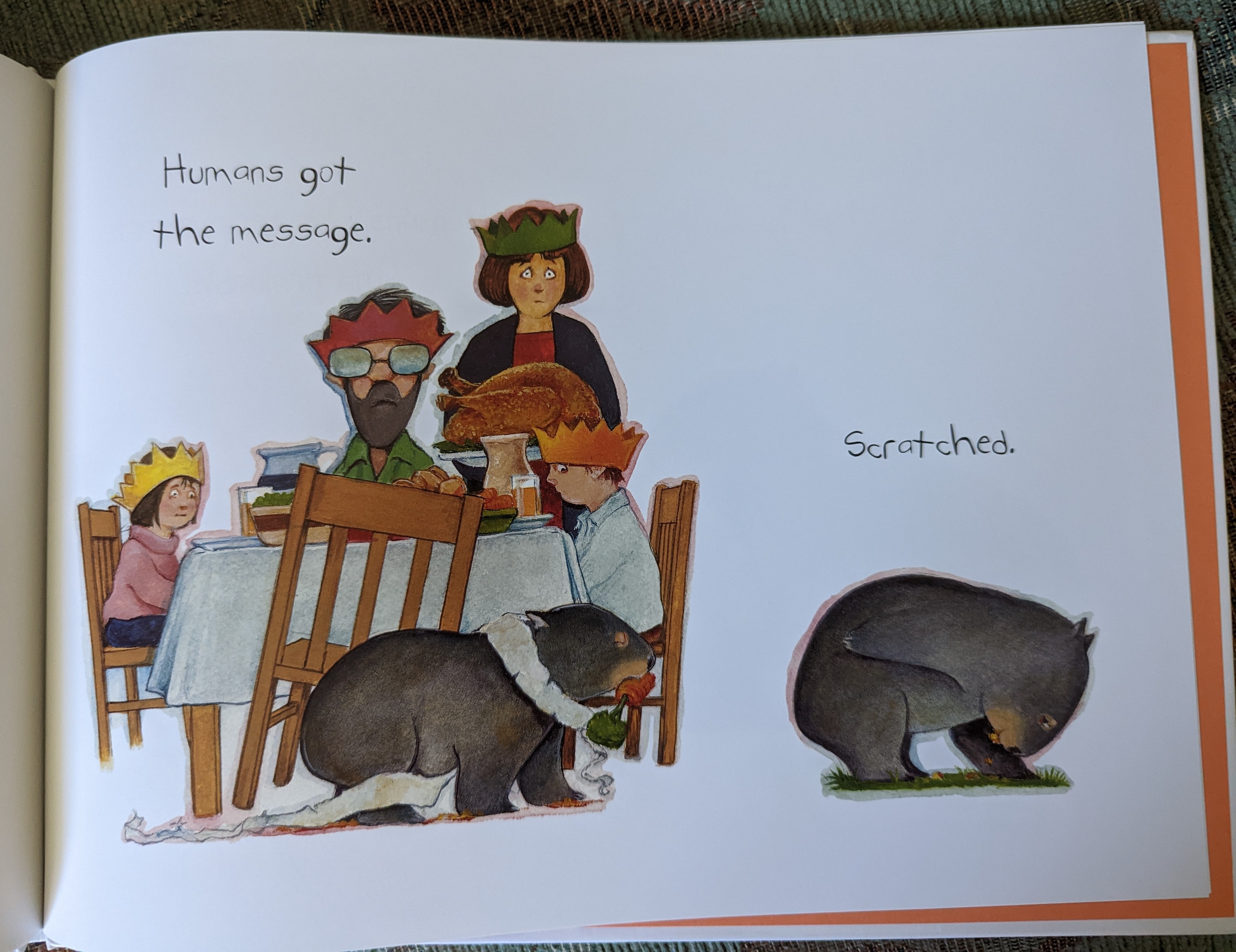 Following the immediately recognisable format of the first – and ensuing books – readers can trace Mothball’s journey from tiny furless solitary joey to rambunctious and bossy big girl, now grandmother. All of us who follow Jackie’s socials love to see the parade of wombats (and other creatures) who make themselves at home at her place. And some of us, such as myself, who have been fortunate to visit Jackie’s place (a couple of times) have been equally excited by significant wombat aspects as with chatting with Jackie :-).