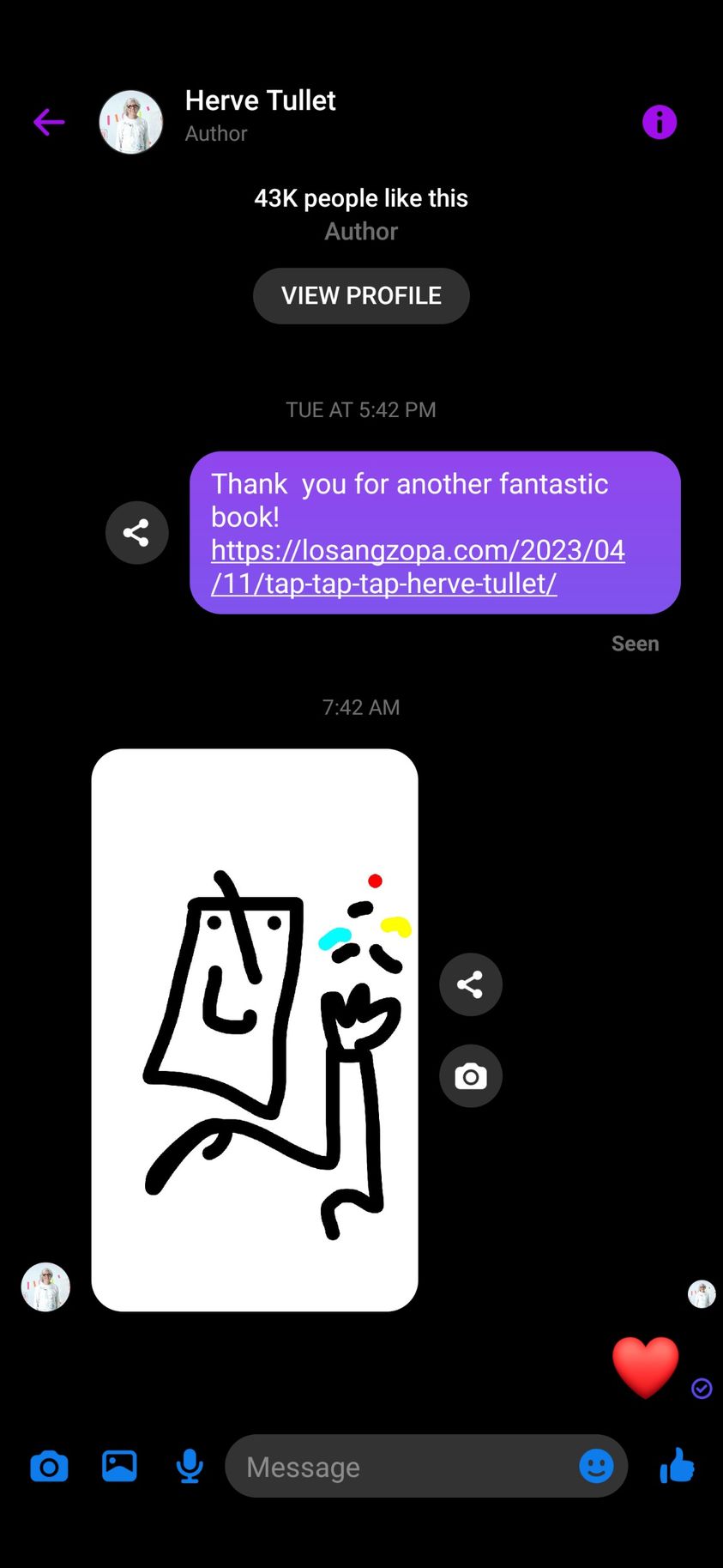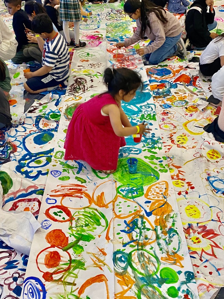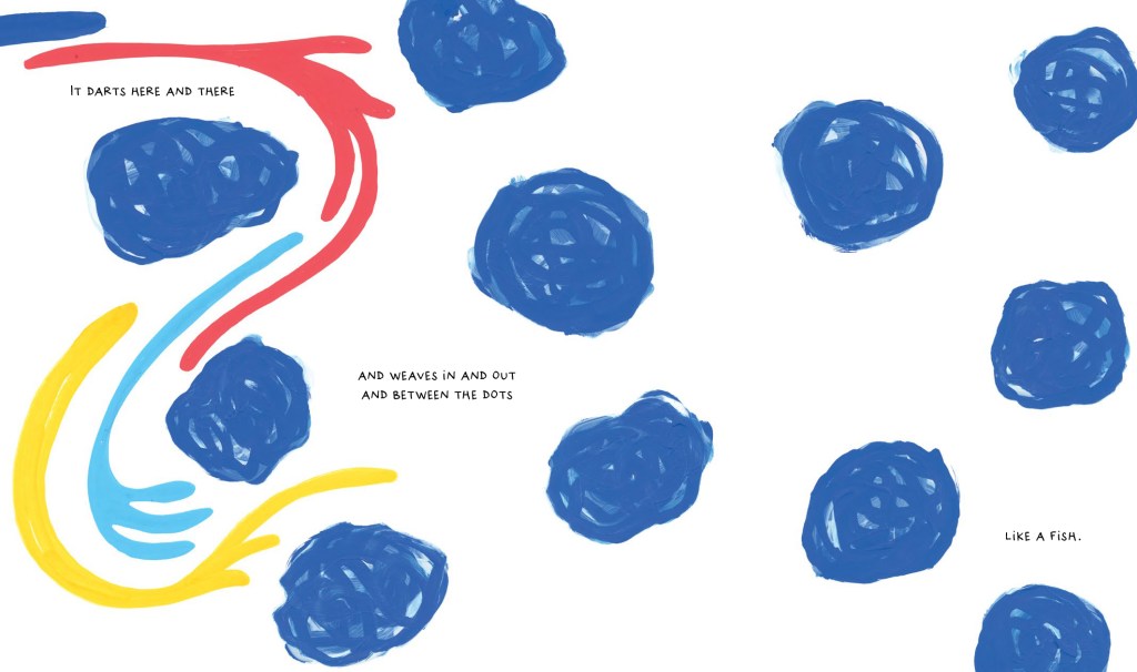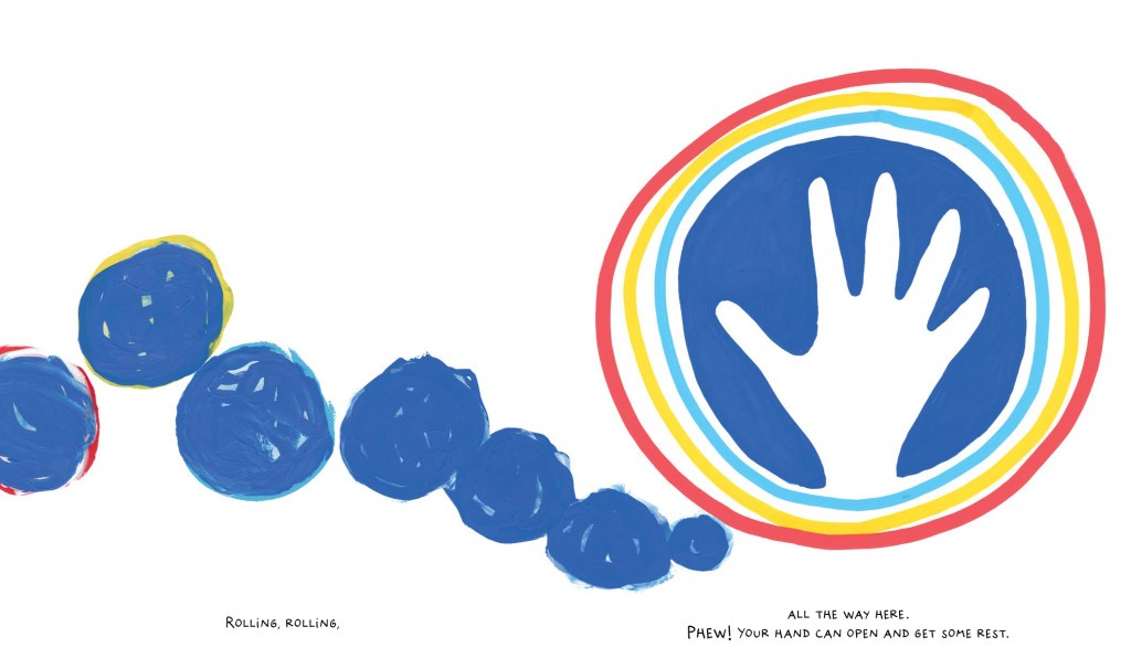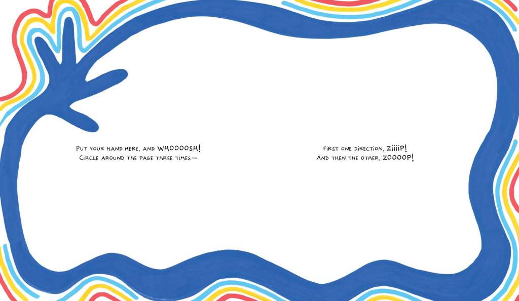Once again the reader is invited into the text, using their hand as a ‘dancer’ who swoops and swirls, leaps and bounds and zooms wildly at times but gracefully at others. All in all, it is just another one of Hervé’s deceptively simple books which is a masterpiece in interactive play. Starting in a gentle way but increasing in complex and intricate movements, with some superb language – ‘curlicues’!!! – readers will once again beg to read it over and over. And, of course, the possibilities for follow up art work are endless.