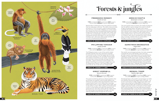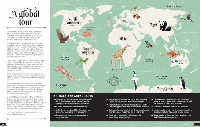 After these introductory pages the tour proper begins starting with the Americas, then Europe, Africa, Asia, Oceania, Antarctica and Oceans. The journey concludes with sections on Endangered Animals, Animal Rights and a very thorough glossary.