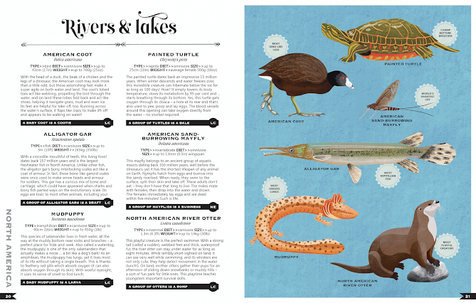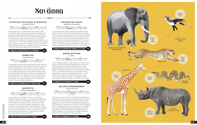 Each spread is just a pure joy and readers will immerse themselves in the factual snippets about each species. To preface the global tour, Tania outlines animal types, plus scientific classifications, and explains succinctly taxonomic rank plus conservation status. She expertly defines habitats, biomes, ecosystems and environments and further details the types of environments.