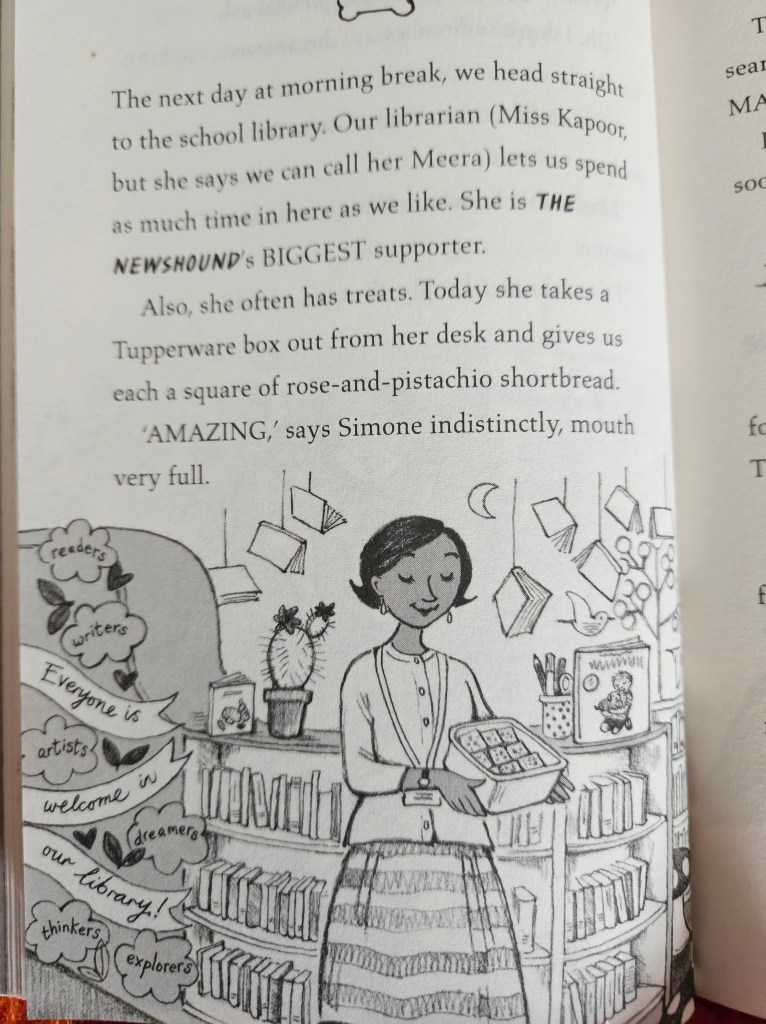 Central character, Eve, is sweet and smart. Together with her besties, Simone and Ash, they research, write and illustrate their own newspaper, the printing of which is aided and abetted by their biggest supporter, school librarian Ms Kapoor aka Meera. It is happy-making to see the diversity included here, with various cultures represented and Ash, identifying as non-binary. [see the article at the end about the author’s ongoing support for this)