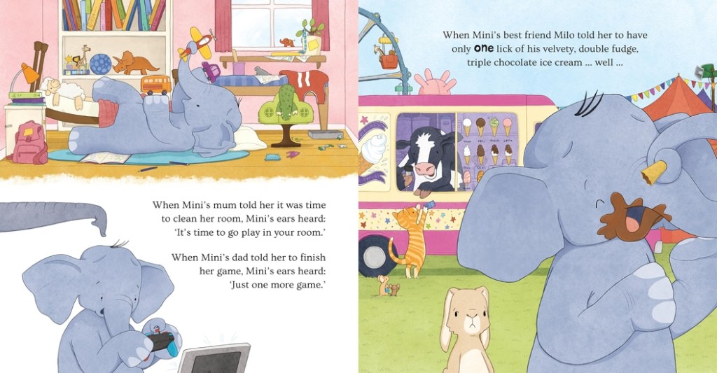 So the first realisation is that she knows she needs to improve the way she uses her ears. She tries a few strategies, with Milo’s help, but these fail miserably. Then – lo and behold! – when there’s a near-miss at the crossing and the lollipop person reminds her to ‘STOP AND LISTEN’ Mini comes up with a new idea. Aside from her over-use of sticky notes, hers is a good thought. With a permanent little reminder sign on her desk, she gradually improves her focus. The author is an experienced mediator/coach and the illustrations are truly appealing.