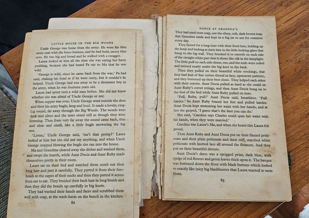A favourite chapter is from the very first book Little House in the Big Woods with Laura’s wonderful description of a family Christmas in the original little log cabin tucked away in the woods. The simplicity of the times, and the family’s circumstances when Laura, her sister Mary and cousins were so thrilled with their new knitted mittens and a candy cane from Santa Claus, and Laura’s extra gift (on account of being the youngest girl) of her rag doll, Charlotte, is just revelationary, and when I have shared it with children, they are quite astonished. Previously, her ‘doll’ had been a corncob wrapped in a piece of cloth!