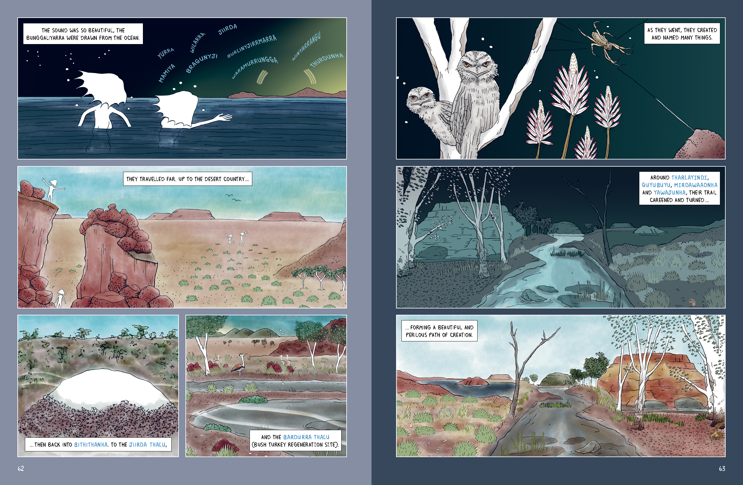 The Corporation commissioned Alex Mankiewicz to undertake the graphics. Alex spent time with the people listening to stories and discovering the landscape and has provided spectacular graphic narratives to detail the traditional stories.