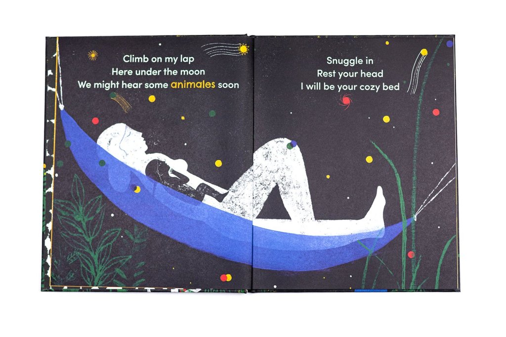 Climb on my lap. We’re under the moon. We might hear some animales soon.