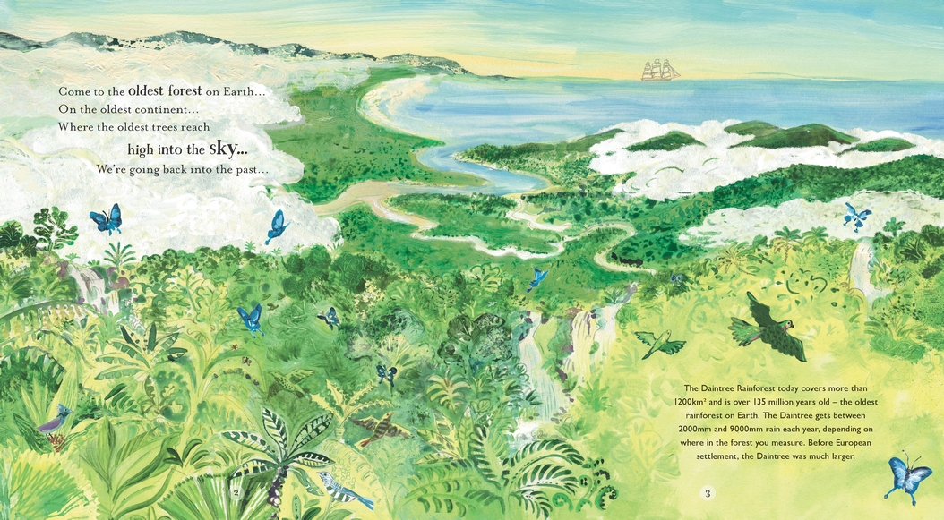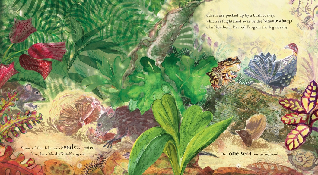 This stunning picture book will both fascinate and inspire your readers. The narrative non-fiction text that follows the growth of a 200 year old Queensland kauri combined with an observer’s eye on the wildlife and daily doings in the rainforest is truly exceptional. Each page is also value-added with an informational paragraph relevant to the spread. And what can be said about the addition of the absolutely glorious illustrations? Stupendous!!!
