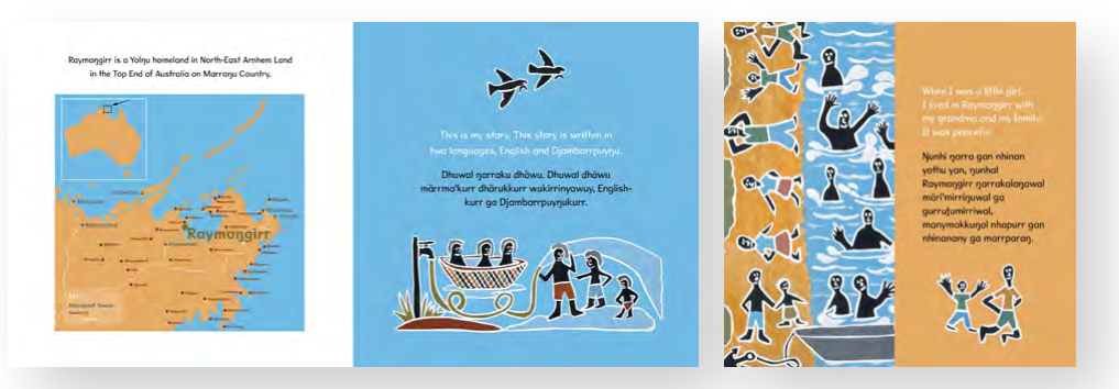 This dual language book is in Djambarrpuyŋu and English, as Kylie says children will understand either or both. Her accompanying artwork reflects the very traditional style of Arnhem Land artwork with the cross-hatching and ochre colours. Having expressed interest in developing her own writing and art skills, Kylie was supported in this by Gapuwiyak Culture and Arts and this first book was developed with her mother and grandmother, to bring greater knowledge and understanding of this very special part of Australia and First Nations culture.