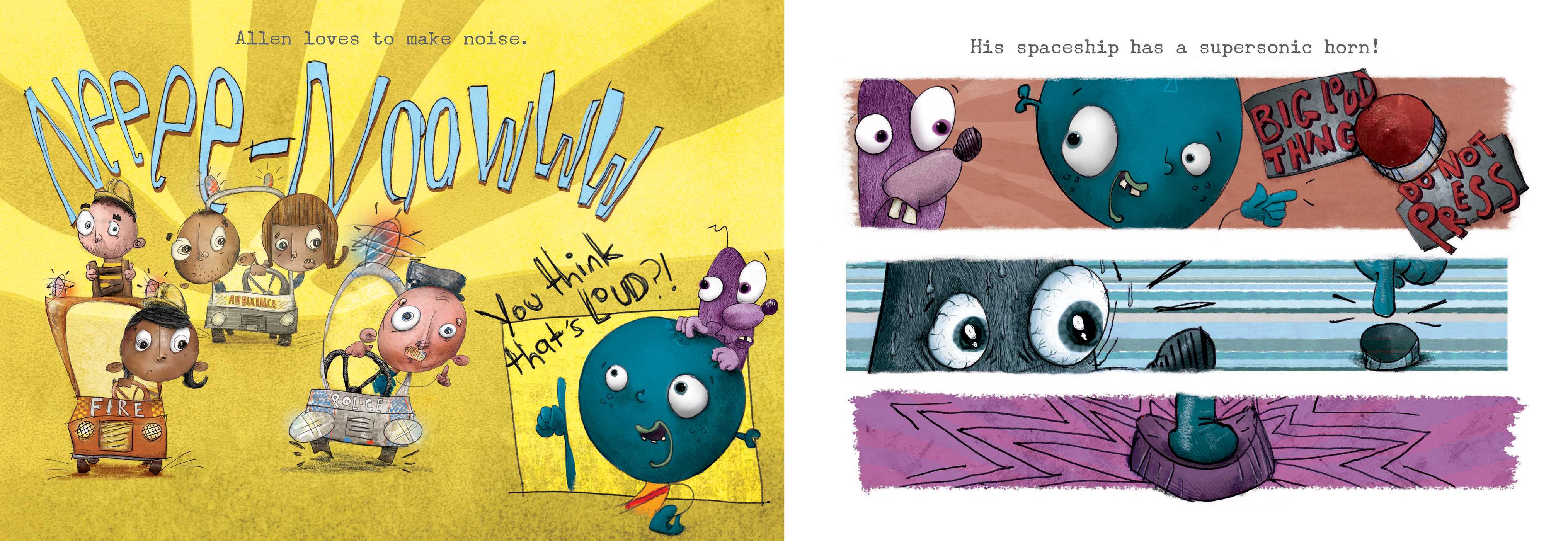 Allen’s rather frightening-looking toys (very much more like nasty weapons to the human eye), his exceedingly loud supersonic horn and his completely horrific dress-ups alienate him (yes, completely intentional) from the Earth children he thinks are enjoying his visit.