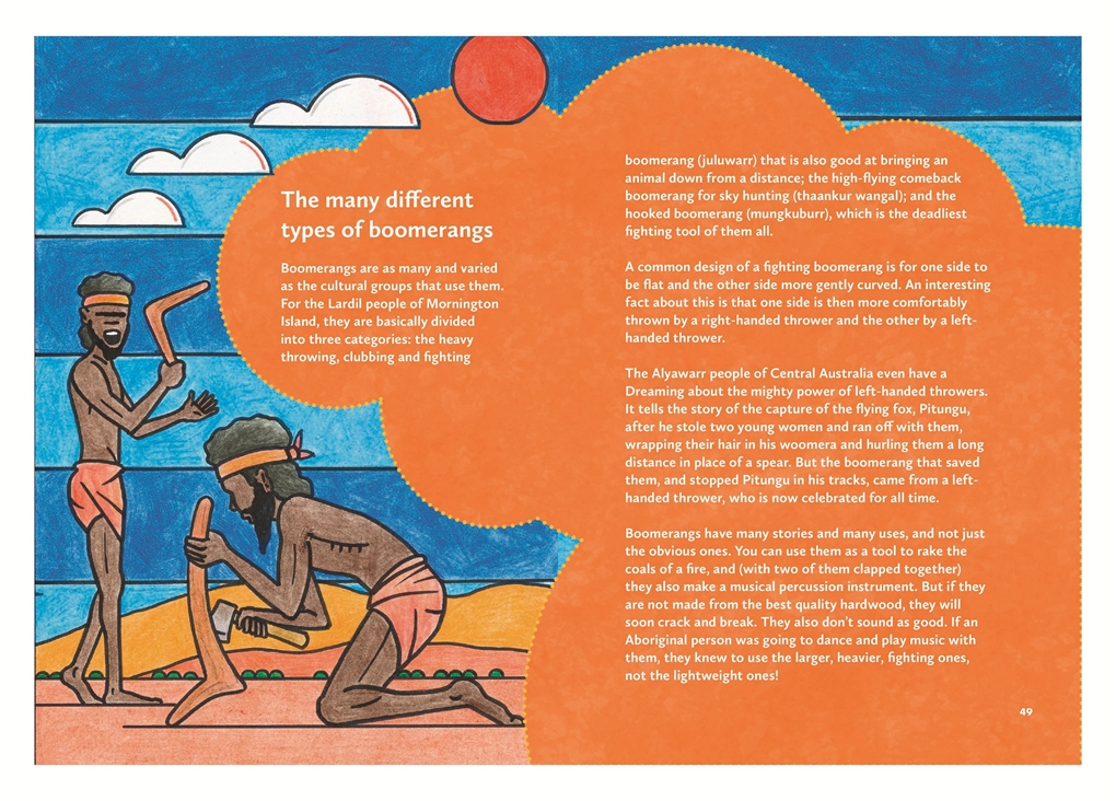 Though I’m no slouch when it comes to cultural knowledge there was still much for me to explore and whether used as a part of a teaching program, or for a young reader to pick up independently it will also provide much of the same for others. I particularly like the tie-ins to contemporary culture or ideas to give readers points of connection e.g. the Bungaree’s Organic Hardware ‘store’ ๐ or the piece Demountables and flat-packs, describing how the people would leave the heavy uprights in place but take down the sheets of bark etc and weight them with grinding stones to leave in place, as they moved on from that area until they returned – the ‘Ikea‘ model. In this way there was no need to build from scratch but simply re-erect the dwelling.