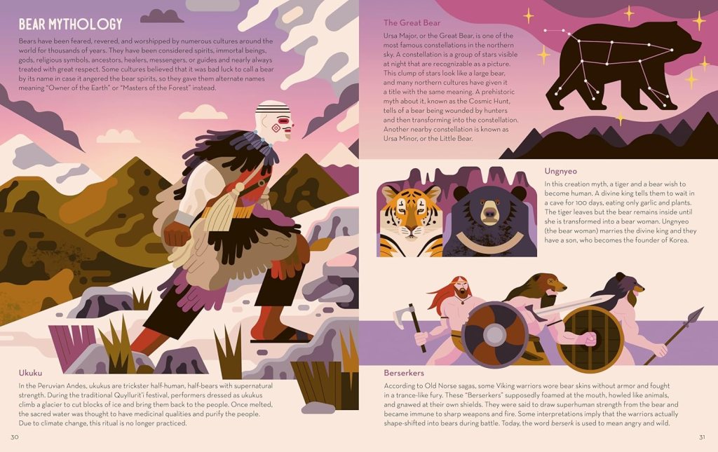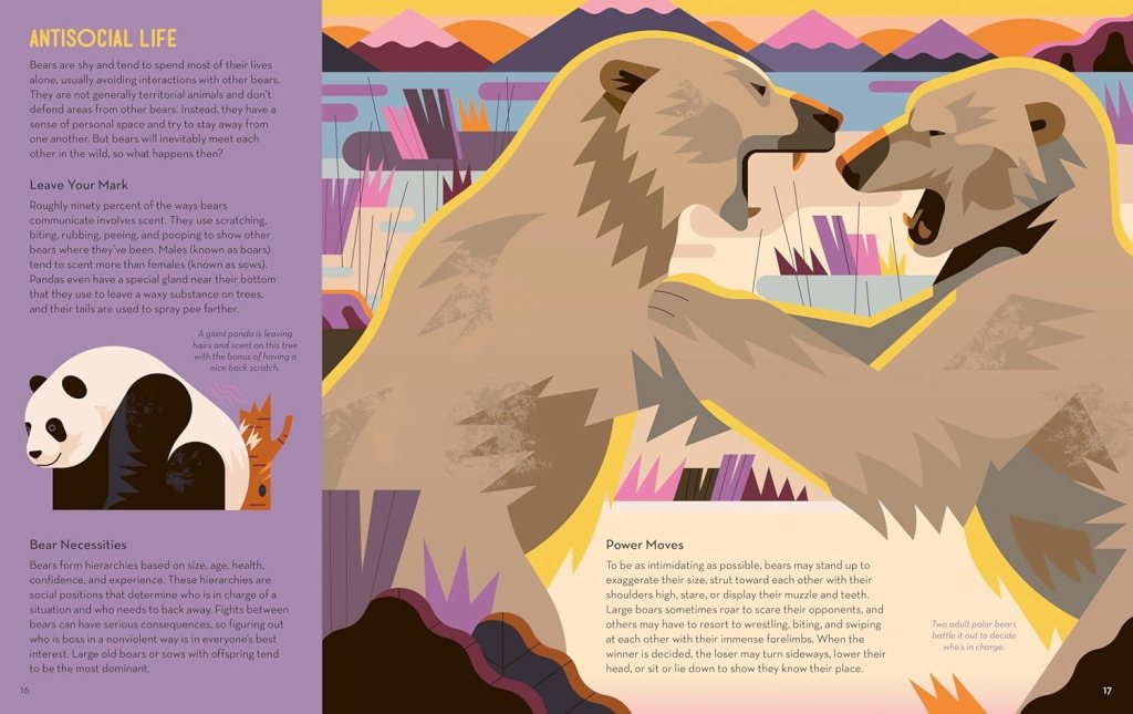 There is a highly amusing double spread on ‘awards’ for special attributes such as pandas having the longest tail and sunbears (despite being the smallest species) having both the longest claws and the longest tongue. I also love the double spread showing the relative sizes of bears and the one that has the lifesize illustration of the polar bear’s head and the sun bear’s (you definitely wouldn’t fit a Kodiak’s lifesized head on a page, I’m sure!).