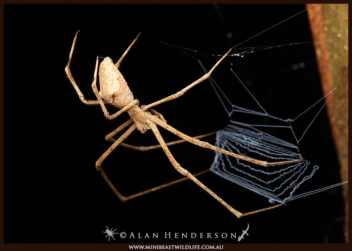 When it comes to specialised hunting techniques in the spider world, you can’t go past these amazing spiders. Net-casting spiders (Asianopis subrufa) are remarkable hunters that create an elastic silk net and hold it with their front four legs. They then suspend themselves above a likely spot where crawling insects may wander. When prey strays within the target zone the spider lunges and expands the net to its full size before letting it rapidly contract around the insect, sweeping it off the ground at the same time. The net is made from multiple strands of looping silk and grips to the spines and hairs on insects in the same way as our socks catch grass seeds.