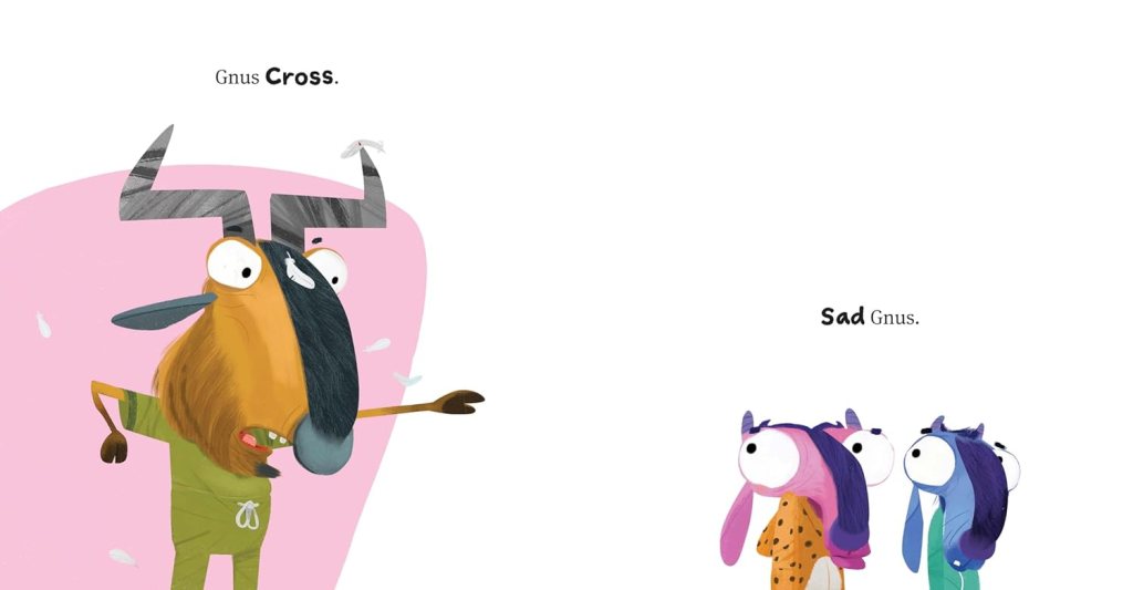As if it’s not enough that wildebeest are odd looking animals, their alternate nomenclature of gnu (which is what I grew up with) just begs for puns. And Phil Cummings has excelled himself. I’m not saying your Smallest of Smalls will ‘get’ all the news/gnus puns but certainly those a little older will start to recognise terms they’ve heard before [although TBH, I hope not many of them are, in fact, watching the news].