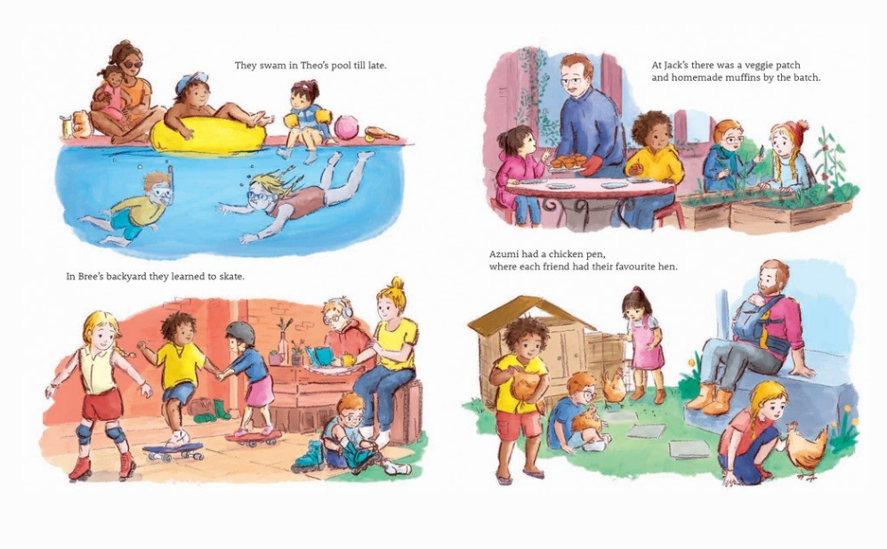 Azumi, Theo, Bree and Jack live side-by-side and back-to-back. These kids are always spending time together – feeding chooks in one yard, skating in another, swimming in one yard and gardening in the next. But boy, it can be a pain having to go the long way around the whole block just to get to the friends on the other side. If only their adjoining corners and fences weren’t there, it would be so much easier – and far more fun!