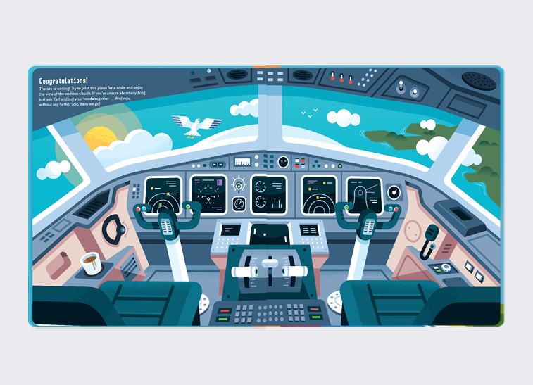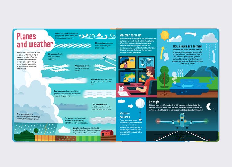 Beautiful illos by Irish artist, Diarmuid Ó Catháin, accompanying author Radka Piro’s terrific information. Double spreads such as Planes that made history, Traffic in the sky, and Planes and poor weather offer up bite-sized chunks of factual descriptions and technical information.