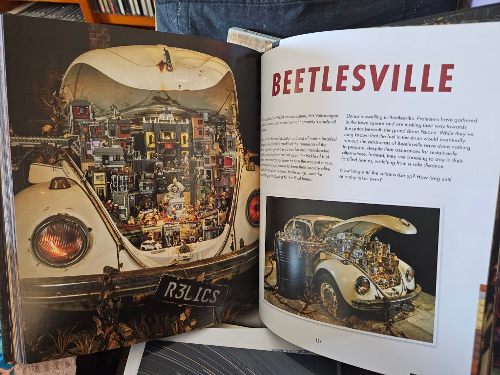Each installation’s chapter is accompanied by close-ups and articles, encylopedia entries, fact files, message threads, surveillance reports on suss minifigs. I cannot possibly decide which is the most fascinating, or captures my imagination the most – Bleach Beach, Studz Diner (in the old jukebox) Cosmic Arcade that uses old arcade game consoles, Cryolife Resort and Wellness Centre in an old Kelvinator style fridge but, my personal favourite [given the fact that I’ve owned five in my lifetime] is Beetlesville in the old VW, although Timepunks Tower (grandfather clock case) comes pretty close as well.