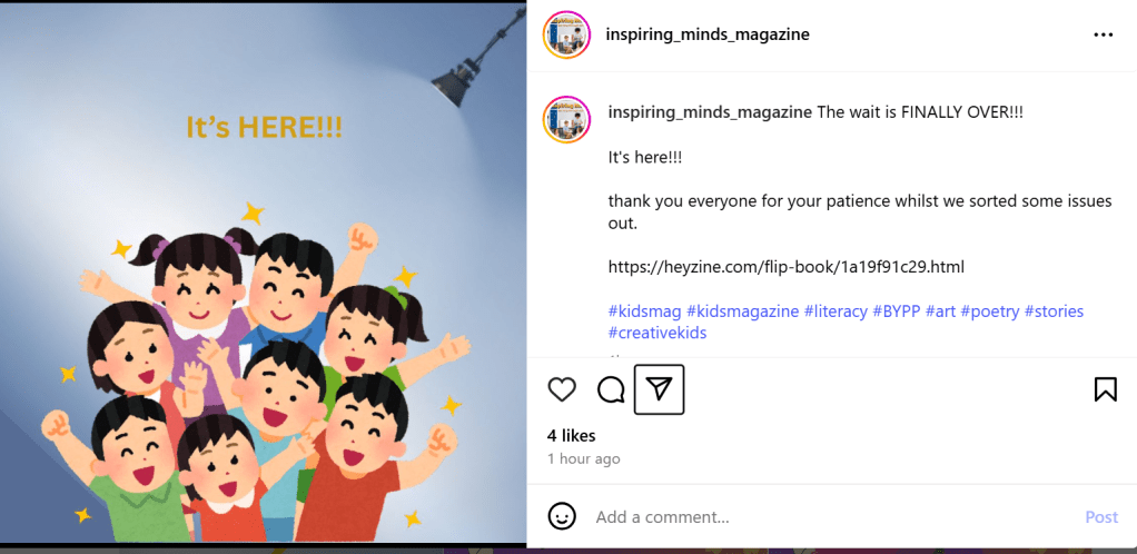 Hey everyone – if you’ve not heard about it yet, Inspiring Minds is a recently launched new free magazine for kids, under the auspices of Daisy Lane Publishing. It’s not just for kids but, in part, by kids. Your kiddos are invited to submit their creative efforts – next issue’s submission date is 10th January. I have great pleasure in announcing that I will be doing a regular column in the mag – and the first one was such great fun, that I know I’m going to enjoy this little extra. Check out the spring issue now – and share! Did I mention that it’s FREE!!!