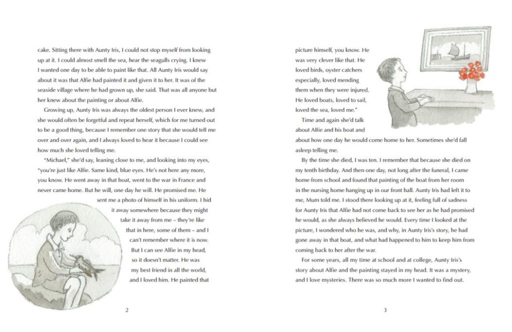 Little Michael knows Aunty Iris as the oldest person in his family, and he loves her and her stories. He especially loves to hear the story about Alfie, who sailed away in the boat in the painting Iris has on her wall in the nursing home. Iris tells the story many times. How Alfie was her special friend and how he gave her the painting and how he sailed away in the war days and never came back.