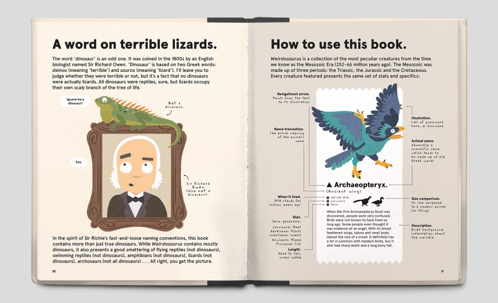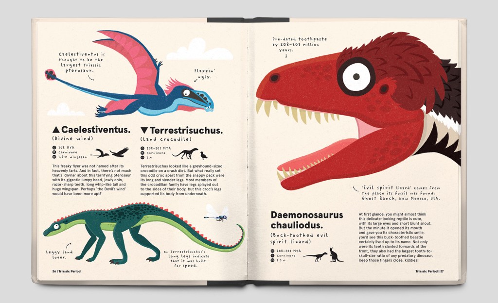 After an introduction where such things as the misnomer of ‘terrible lizard’ is explained, the book travels through the Triassic, Jurassic and Cretaceous periods, the great ages of the dinosaurs. The wildly colourful illustrations [again – iconic Philip Bunting!] will have any reader in fits of laughter with the expressions these dinosaurs are assuming, not to mention the often snide and silly captions and labels.